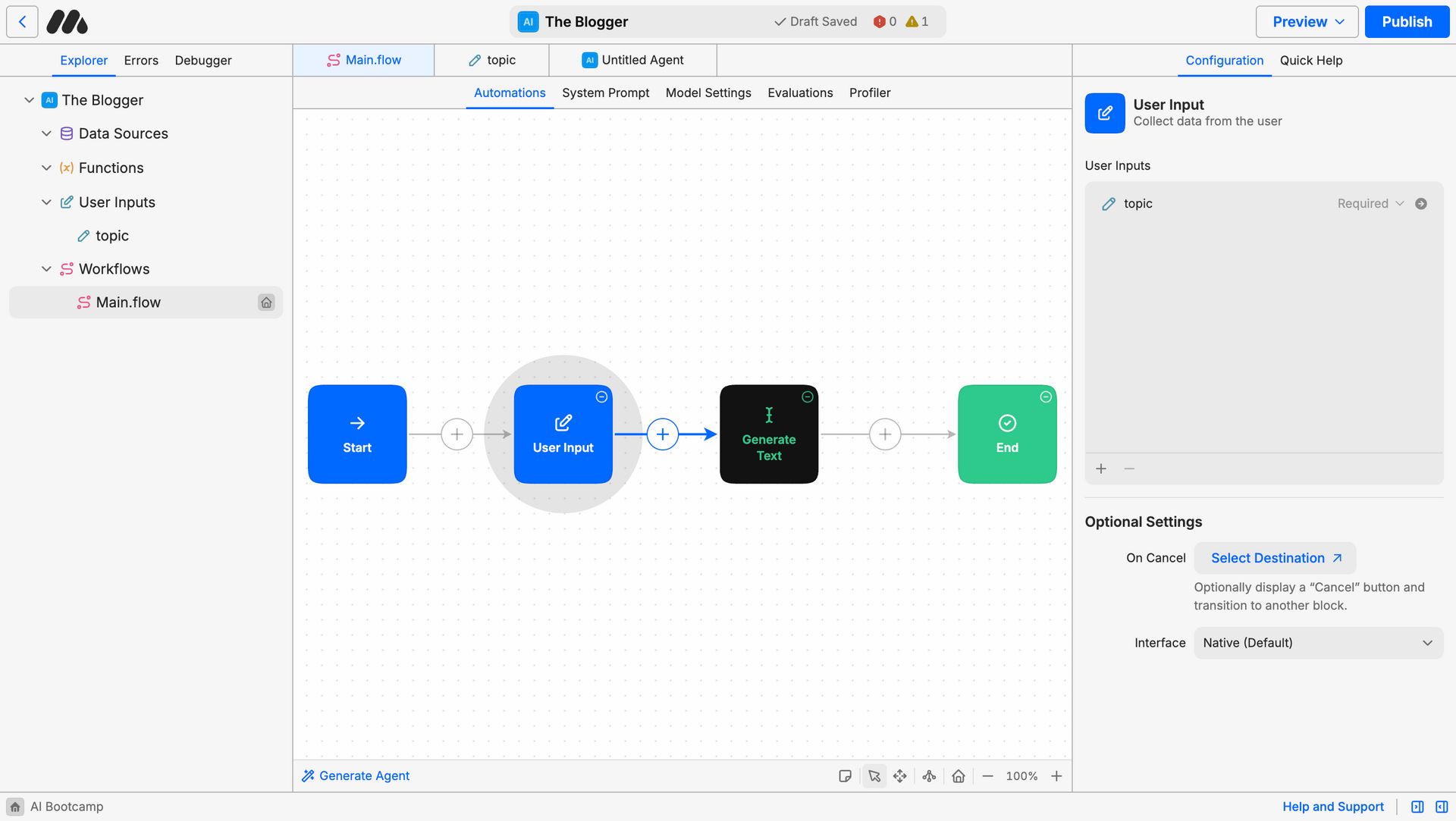 Click on “Open Draft Agent” - Run your agent.
